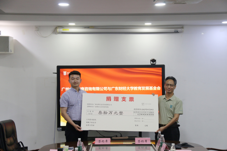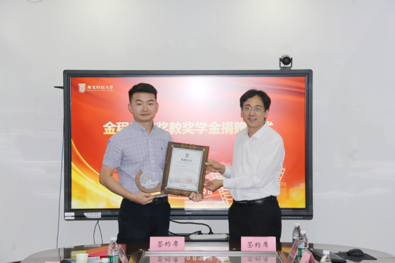 在全场嘉宾的共同见证下,广州金程信息咨询有限公司总经理郭成彬与广东财经大学教育发展基金会秘书长段丹共同签署了奖教奖学金捐赠协议。经济学院院长聂普焱代表学院接受捐赠。广州金程信息咨询有限公司为经济学院捐赠30万元,专门用来奖励在教学、科研有创新贡献的教师以及学生发展。张凯向广州金程信息咨询有限公司颁发捐赠证书及 “慈善使者”铭牌。