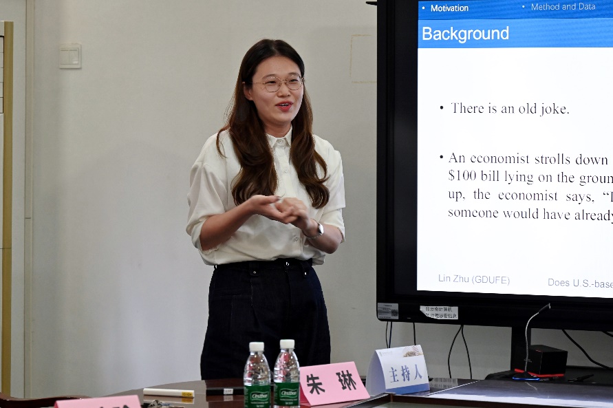 随后,朱琳老师作英文实证论文学术分享,主题为“Does U.S.-based Academic Research Enhance Global Market Efficiency?”(美国本土的学术研究能否提升全球市场效率)。
