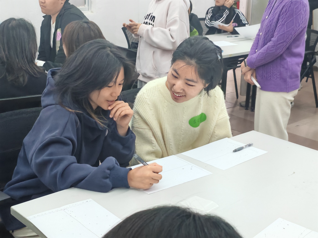 深度探索环节,“我的故事”让成长轨迹可视化。同学们在纸上绘制人生坐标轴,横轴之上标注获奖、相遇挚友等高光时刻,横轴之下则是记录挫折、迷茫等低谷经历,一个个圆点串联起成长的起承转合。两人一组的深度交流中,大家敞开心扉,分享那些影响深远的人生节点。