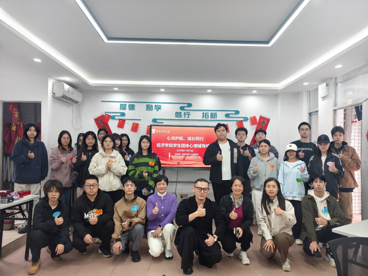 2025年11月18日,经济学院(广州校区)学生团体心理辅导活动在杜鹃苑105活动室顺利举办。本次活动由国家二级心理咨询师、1993级国贸专业校友曾远志携手心理咨询师黄文冠、曾碧梅共同领航。2022级数字经济(佛山校区全学段)、2023级各班和2024级、2025级国际商务(中外联合培养项目)班共计28位心理委员、班长参加了本次活动。2023级辅导员李珊老师开场发言,全程参与学习。一场以“破茧・识我”为主题的团体心理辅导活动温情启幕,学生骨干们在沉浸式互动中解锁自我认知的新维度,在心灵碰撞中凝聚成长力量。