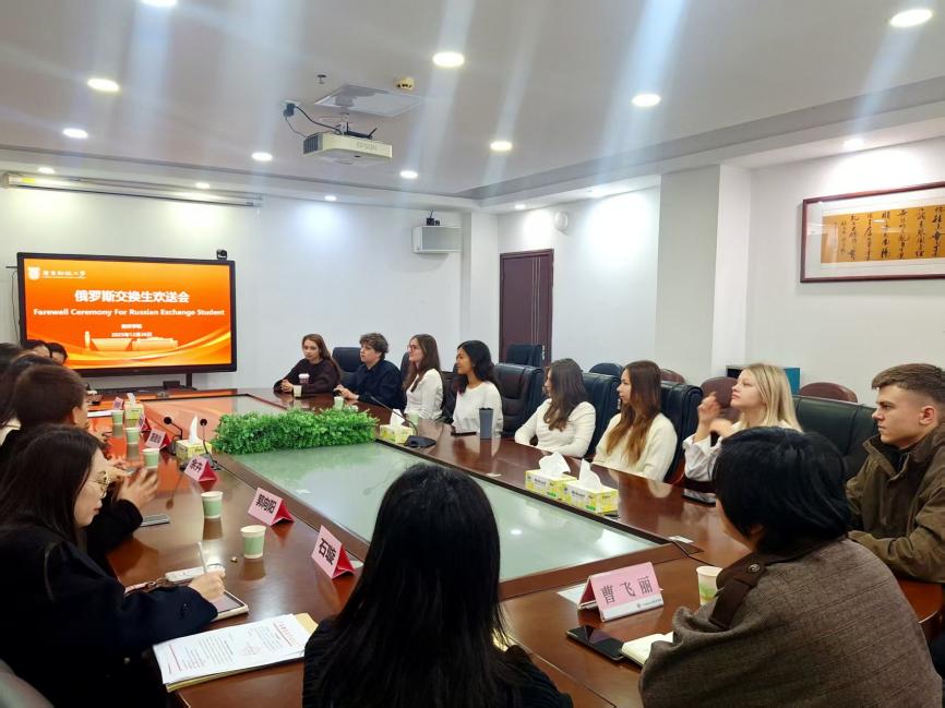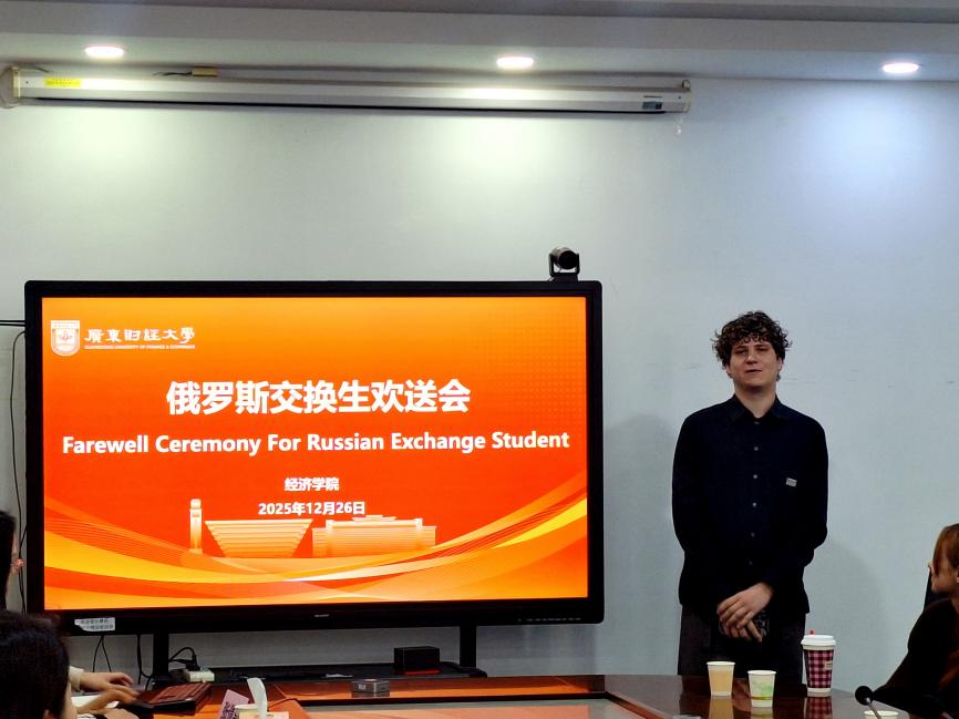 时光匆匆,情谊绵长。2025年12月26日,经济学院为俄罗斯交换生隆重举办欢送会,为这段跨越国界的校园时光画上温暖句点。现场师生齐聚一堂,氛围温馨而热烈。参加本次欢送会的有我校国际交流与合作部部长余卉、副部长郭向阳、副科长石璇,经济学院党委书记钟雄星、院长聂普焱、副书记曹飞丽、副院长张倩男、副院长柴盈、留学生专职管理员黄慧老师及8名俄罗斯交换生。欢送会由副院长张倩男主持。