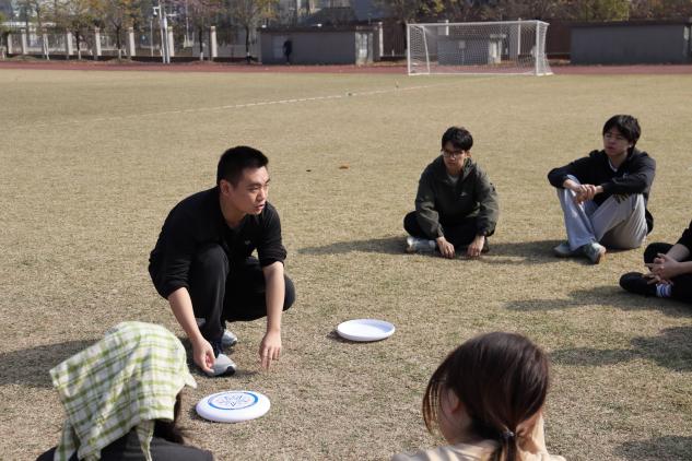 本次活动特邀我校飞盘运动爱好者、优秀毕业生宁嘉豪校友担任教练。宁嘉豪学长首先系统讲解了飞盘运动的基本规则、礼仪规范与安全注意事项,随后对握盘、投掷、接盘等关键技术动作进行了分解示范与详细讲解。在随后的分组练习环节中,他耐心细致地进行一对一指导,及时解答同学们在实践中遇到的问题,帮助大家迅速掌握动作要领。