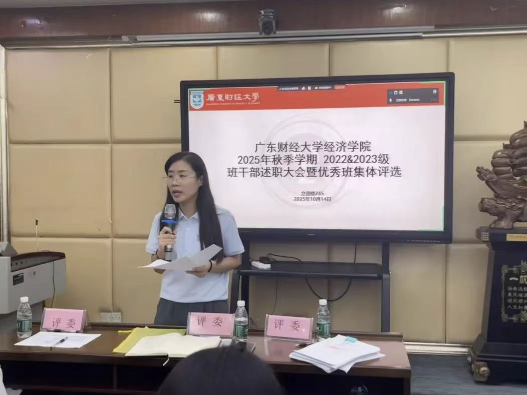 为提升学生骨干素养,加强班集体凝聚力,营造良好班风学风氛围,10月14日,经济学院学生骨干述职大会暨优秀班集体评选分别在广州校区立德楼245、佛山校区同心楼101举行。经济学院党委副书记曹飞丽、班主任代表岑聪、各年级辅导员,各班班长、团支书、年级委员、党建中心以及团委学生会学生代表参会。