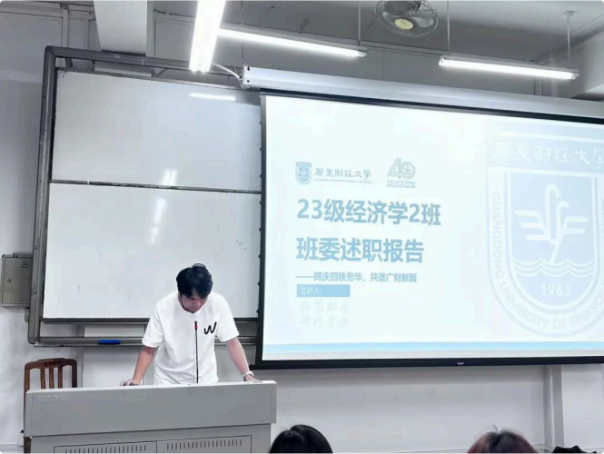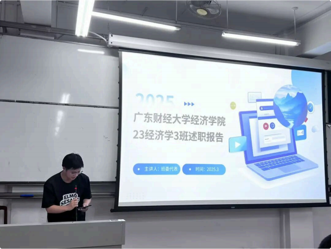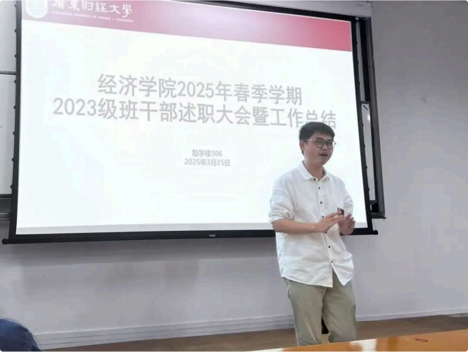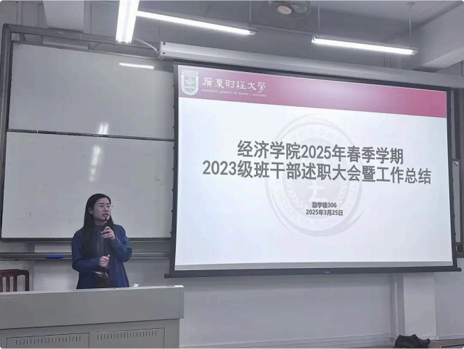 为全面总结班级建设成果 ,强化班委责任担当 ,提高班集体凝聚力 ,推动新学期学生工作高质量发展。3 月 25 日晚 ,经济学院在佛山校区励学楼 306 召开 2023 级班委述职暨工作总结大会 ,辅导员张李敏、李珊 ,年级委员、各班班委及团委学生会代表参会。会上 ,13 个班级的班委代表依次登台 ,围绕思想领、学风建设、班级管理、文体劳动、心理团辅以及表彰获奖等方面 ,汇报 2024-2025 学年第一学期班级工作成效 ,制定新学期工作计划。