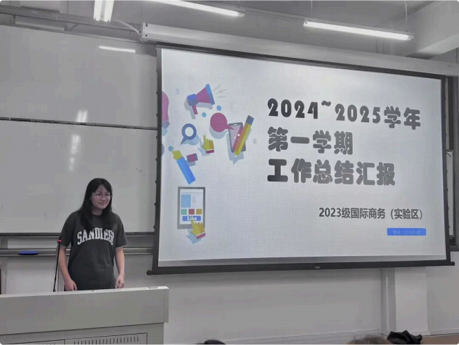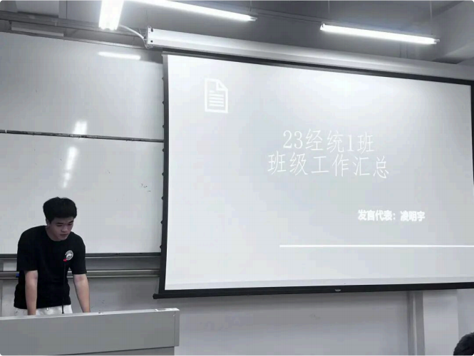 汇报过程中 ,各班展⽰了班级同学获奖情况。2023 级共有 97 名同学获学校本科生专项奖学金;数字经济学 1 班、 国际商务实验区、经济学实验区和经济学 3 班获学院优秀班集体;经济统计学 2 班全班志愿服务时长达到 4410 小时 ,人均志愿服务时长 91 小时 ,其中 14 位同学志愿时长超 100 小时 ,展现了新时代经院学子的责任担当。