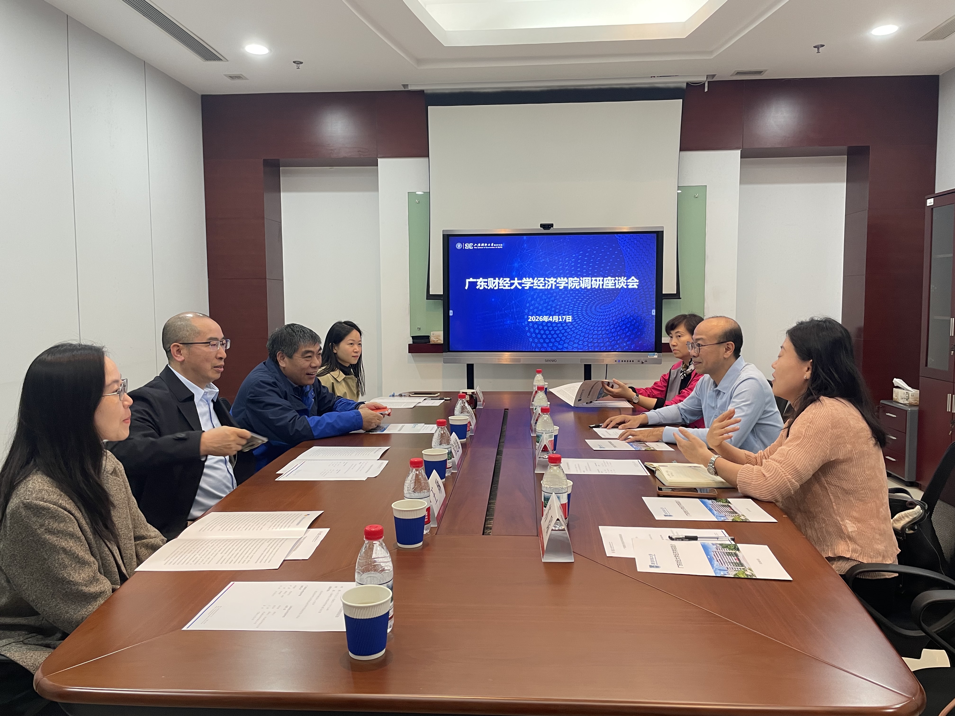 为深入推进学院学科建设高质量发展,扎实做好经济学院学科建设内涵式攻坚,2026 年 4 月 17 日下午,经济学院党委书记钟雄星率队赴上海财经大学经济学院开展专题调研交流。上海财经大学经济学院副院长常进雄、副院长冒佩华,政治经济学系副主任王琳、办公室主任张迪热情接待调研团。